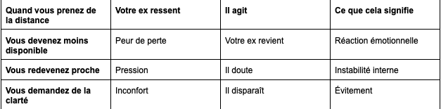À l’inverse, si votre ex revient puis reprend exactement le même éloignement, le cycle reste intact. Même scénario. Même distance. Même retour. Le temps passe, mais rien ne se consolide.